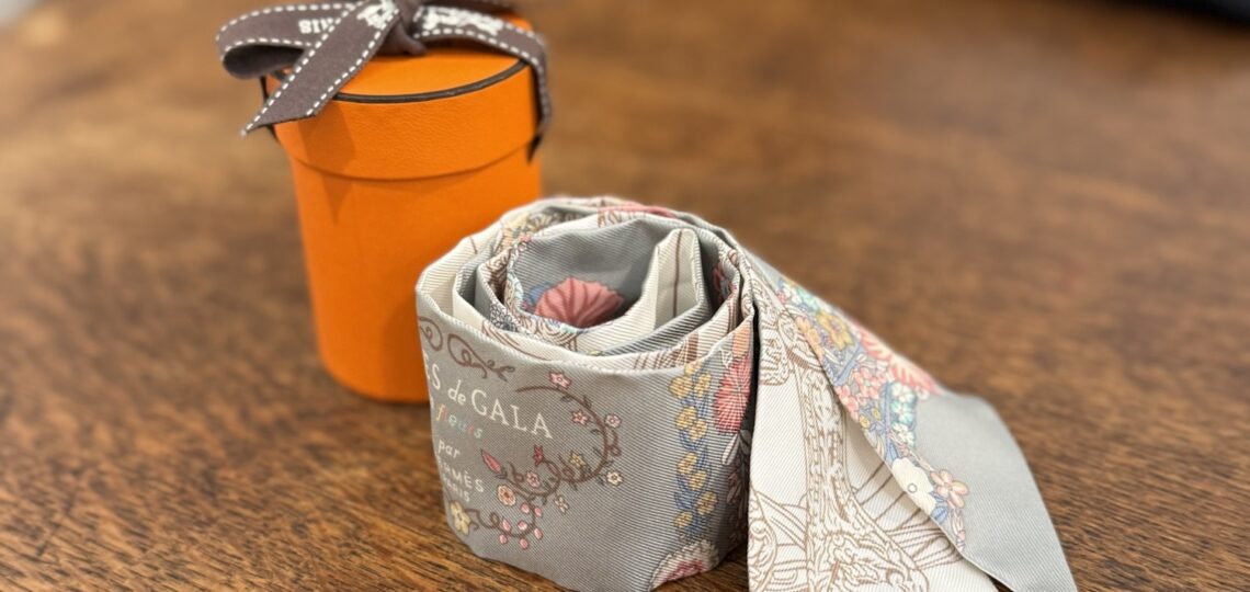 HERMES エルメスのツイリーが入荷しました。《ブリッド・ドゥ・ガラ・アン・フルール&アイライナー》エルメスの名作モチーフをアレンジした人気柄です。 象徴的な馬術柄(デザインブリッド・ドゥ・ガラ)と花々と果物の牧歌的モ…