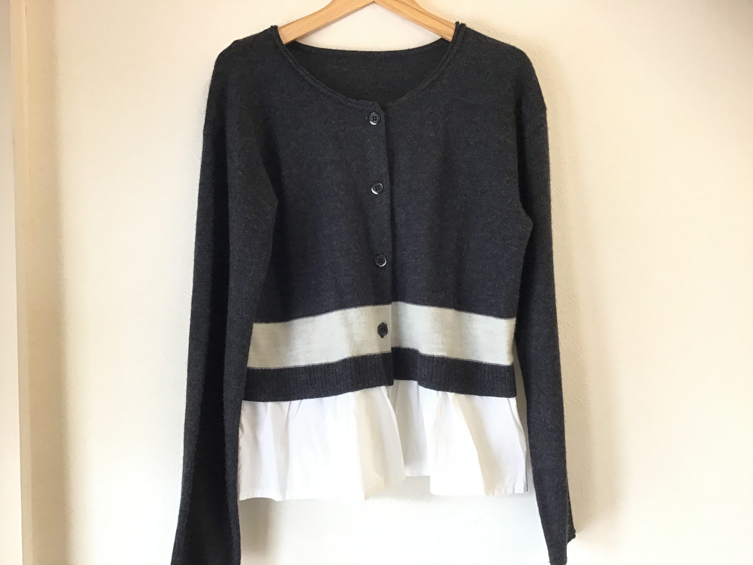 裾に白のブラウスがドッキングしたウールカーディガン。まだ少し肌寒いこの時期にぴったりです。
