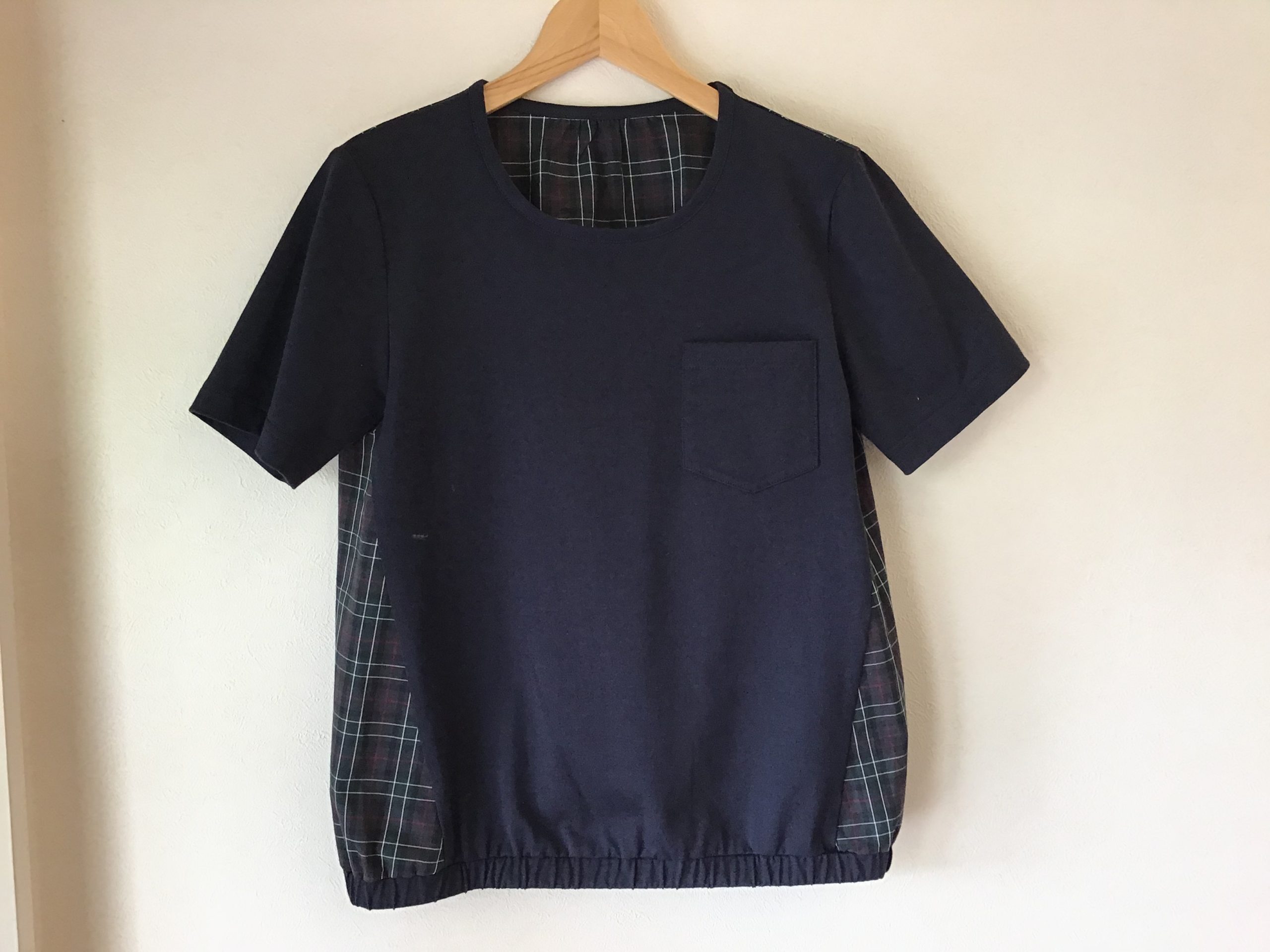 ネイビーの半袖カットソー。チェック柄のブラウス生地を組み合わせた可愛いデザインです