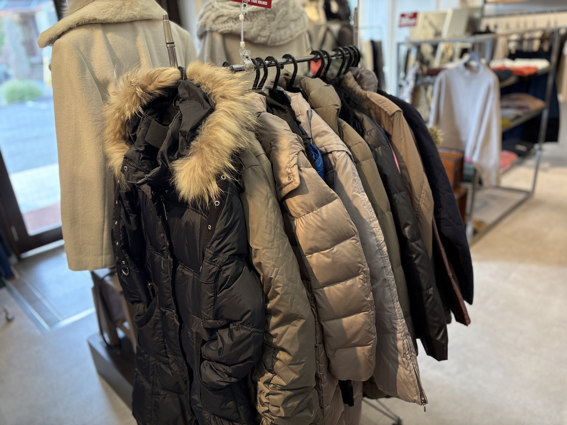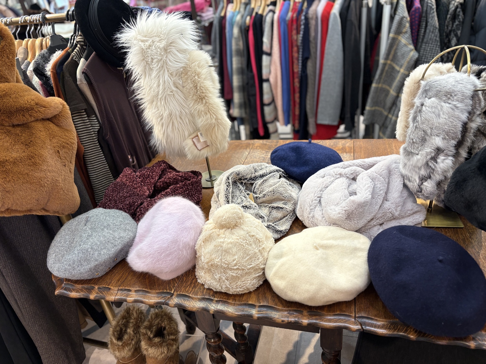 寒さに備えてアウターやマフラー、ファーストールなどをたくさん店内に並べました。