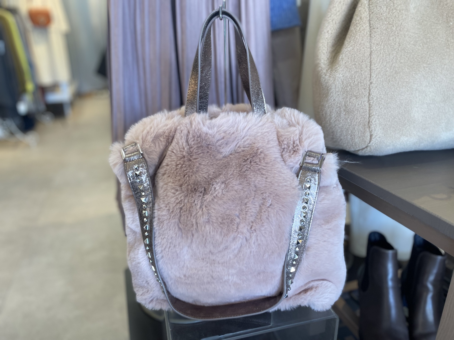 ちょっとハードなスタッズの持ち手とふわふわピンクのファーのミックスがオシャレ![]()