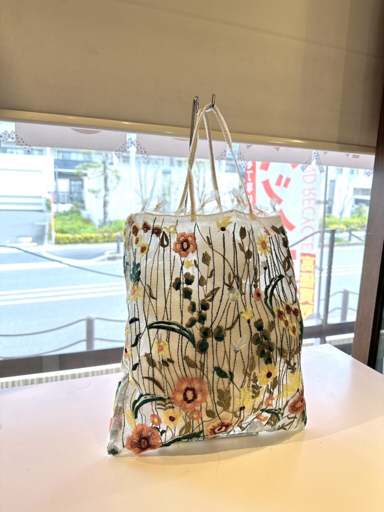刺繍が目を引くノーブランドのチュールシースルーバッグ。
