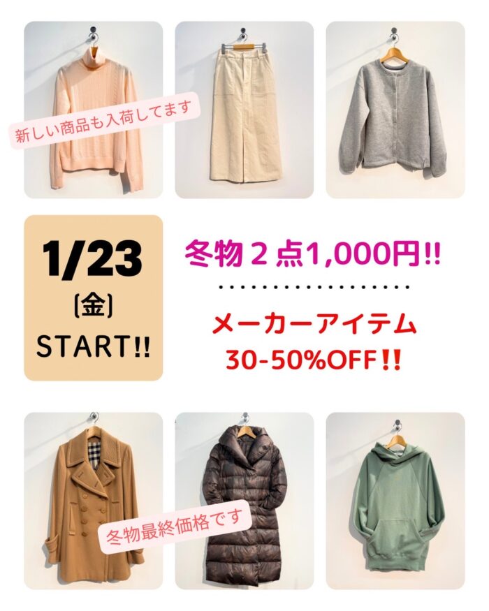 こんにちは(^^) 16日(金)より冬物再値下げSALEがスタートしました。 2点以上お買い上げでレジにて半額♪(๑ᴖ◡ᴖ๑)♪ お買い得商品がたくさん揃っています。 アウターなども1,000円台で購入できます。 1,0 …