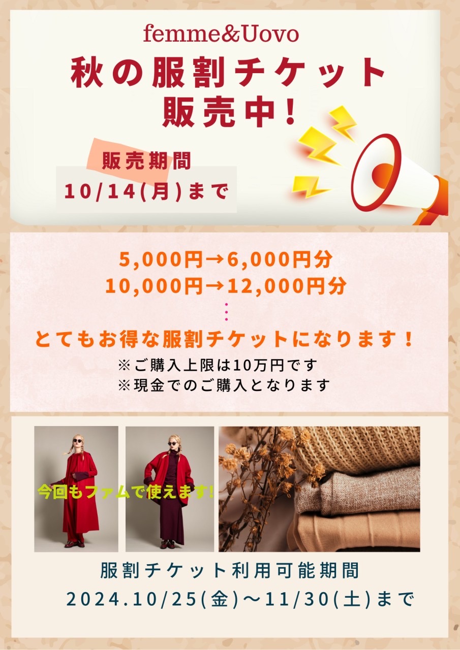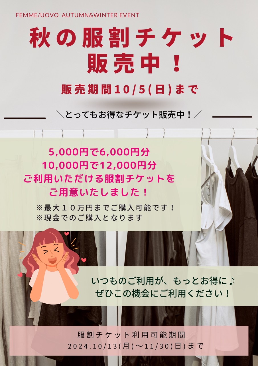キャンペーン 秋の服割チケットの販売が始まります♪ Author Shibahara Date 2025/09/21 こんにちは😃 朝晩が涼しくなってきました。 夜寝る時は少し寒いと思うくらいです。 ただ日中の気温はまだ30℃。暑いですね。 体温調整がしやすいお洋服があると便利ですね😊 さてさて、今年もや