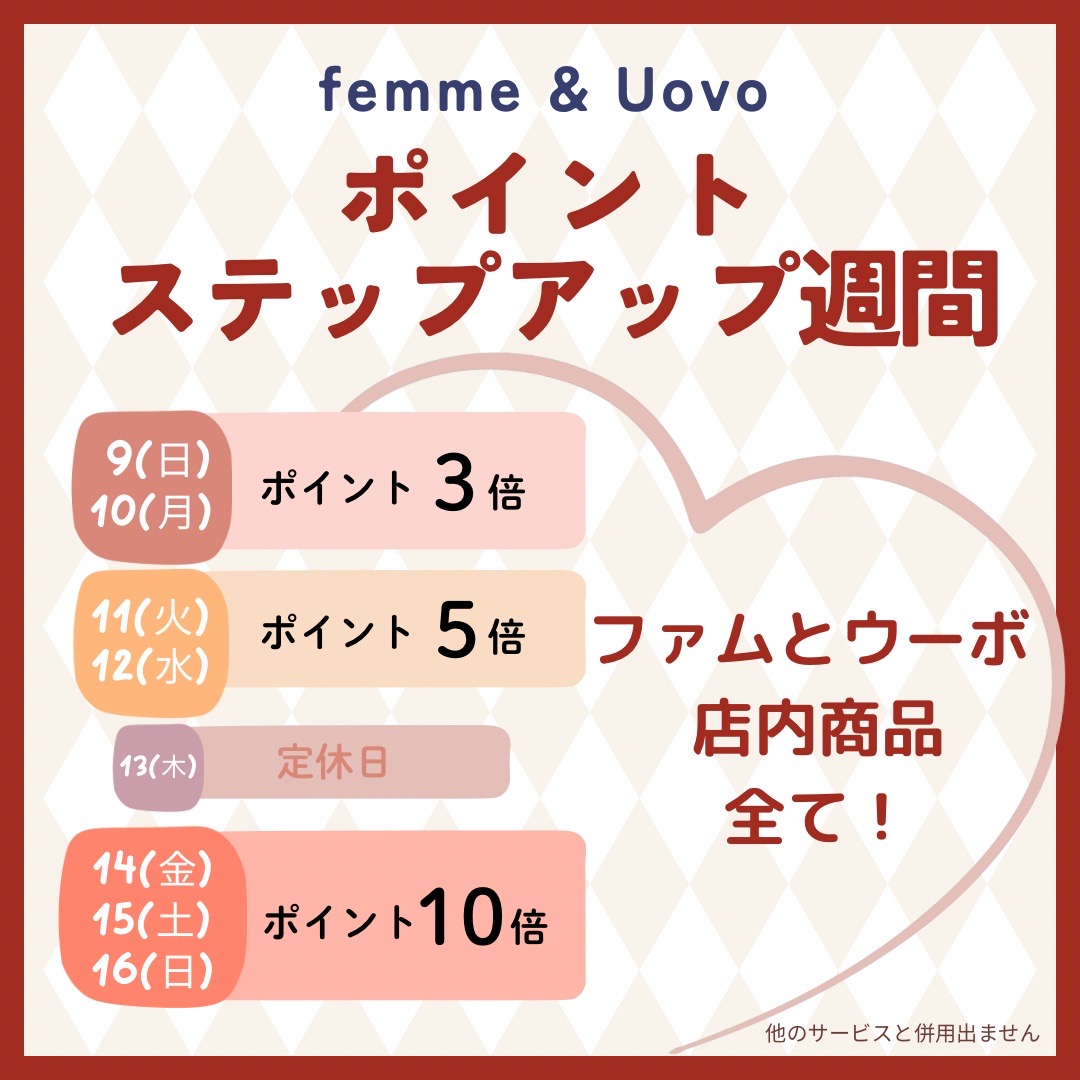 キャンペーン, 日記, 買取商品 今日からポイントアップキャンペーン Author Shibahara Date 2025/11/09 こんにちは。 今日は朝から雨☔️ 日差しがないので肌寒い1日ですね。 ウーボ&femmeでは今日からポイントアップweekが始まります。 3倍→5倍→10倍と週末にかけてポイントがUP╰(*´︶`*)╯♡ この