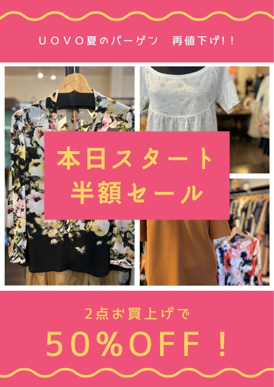 梅雨明けから約1週間経ちましたが連日暑いですね。この夏何回書くことやら…ウーボでは夏物最終SALE開催中です。 2点1,000円の商品もまだまだたくさんありますよ。アクセサリーなどの小物類との組み合わせもOK。デイリーに…