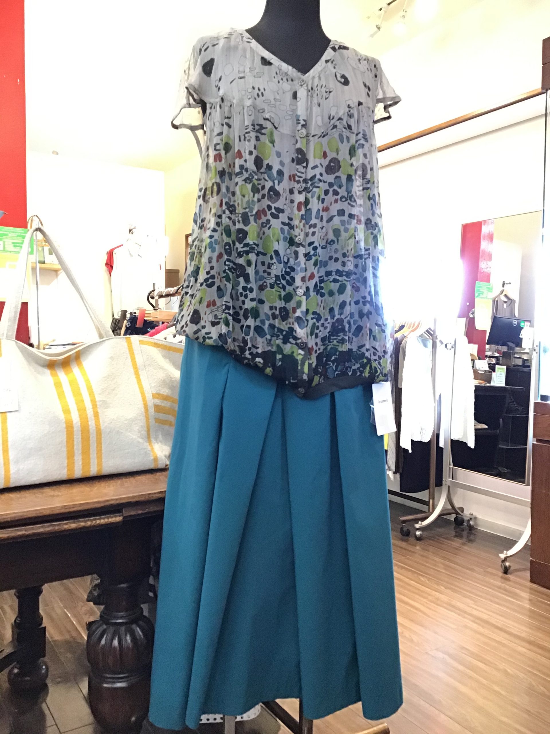 今日は午後から雨予報。朝は晴れていましたが、変わりやすいお天気ですね。雨が降る前にお買い物に来て下さいね。では今日は晩夏商品をご紹介します。 こちらのボトムスはHIROKO BIS ヒロコビスブルーグリーンの…