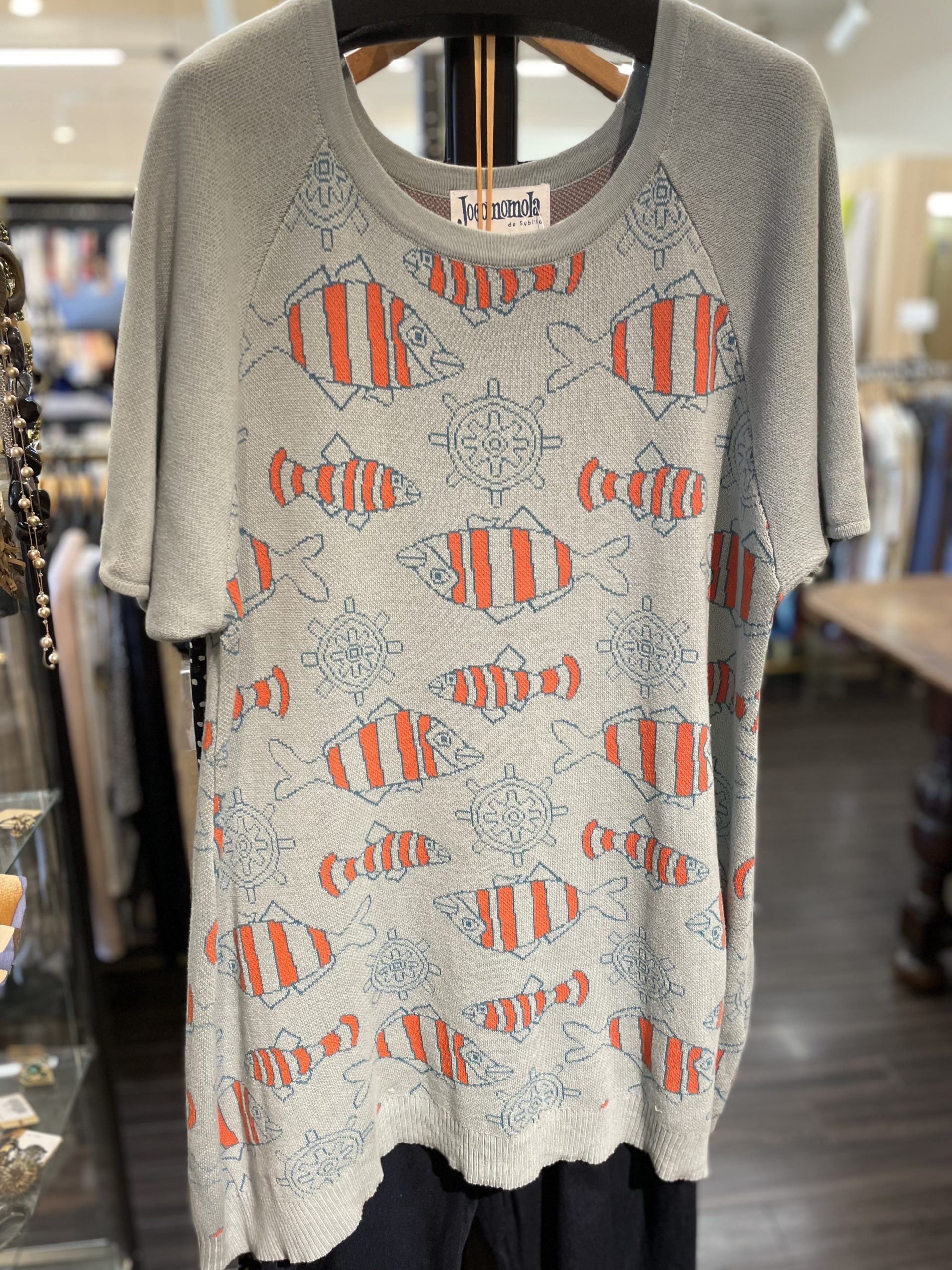 今日は朝から蒸し暑いですね。また台風接近で夜から雨予報です。大雨にならないといいのですが。。。では今日も店頭の商品をご紹介します Jocomomola ホコモモラ可愛い魚柄のコットン半袖ニットが入荷中です。ち…