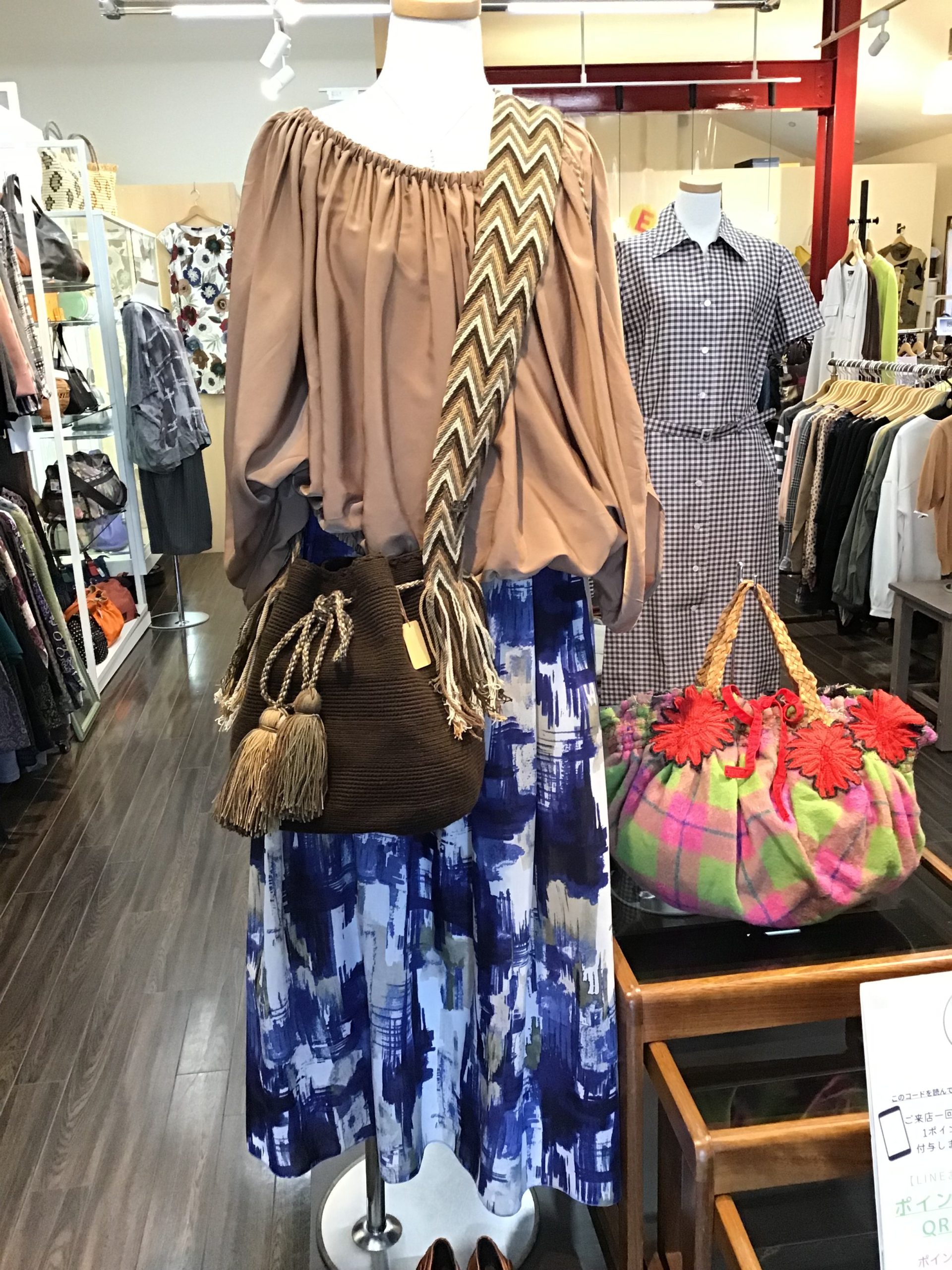 先日の雨から少し涼しくなった気がします。日中は暑いですが朝晩は涼しいですね少し秋に近づいているのかもしれませんね。というわけで、今日は店頭の秋コーデをご紹介 初秋はまだ残暑が厳しいので少し爽やかさもプラスバッグで秋らしさ…