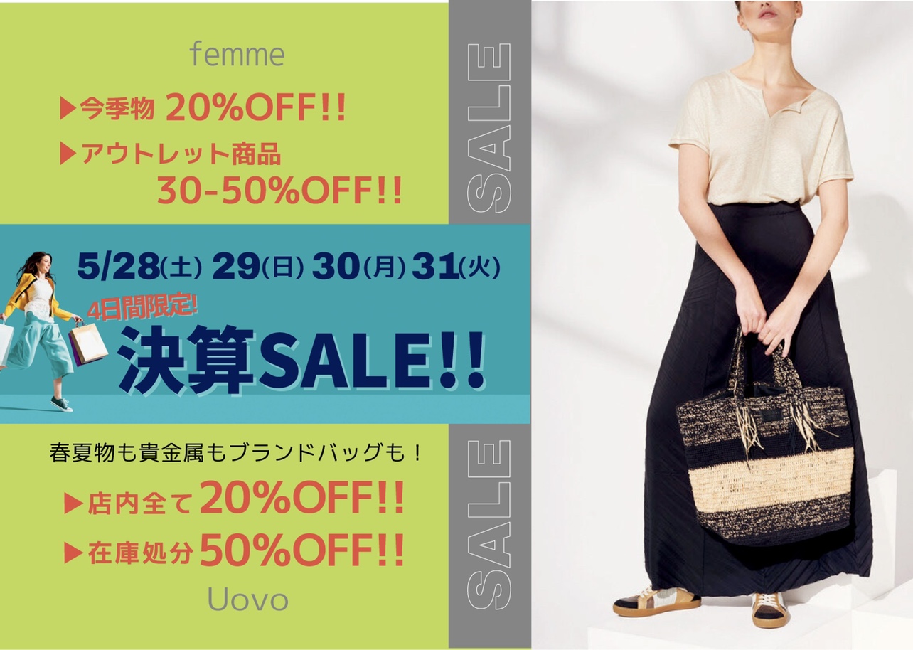 今日から5/31までの4日間、決算SALEを開催です店内商品ほぼ全品20%OFF30%OFF、50%OFFの商品も取り揃えております 店内商品全て20%OFF❗️夏物もお買い得です 50%、3…