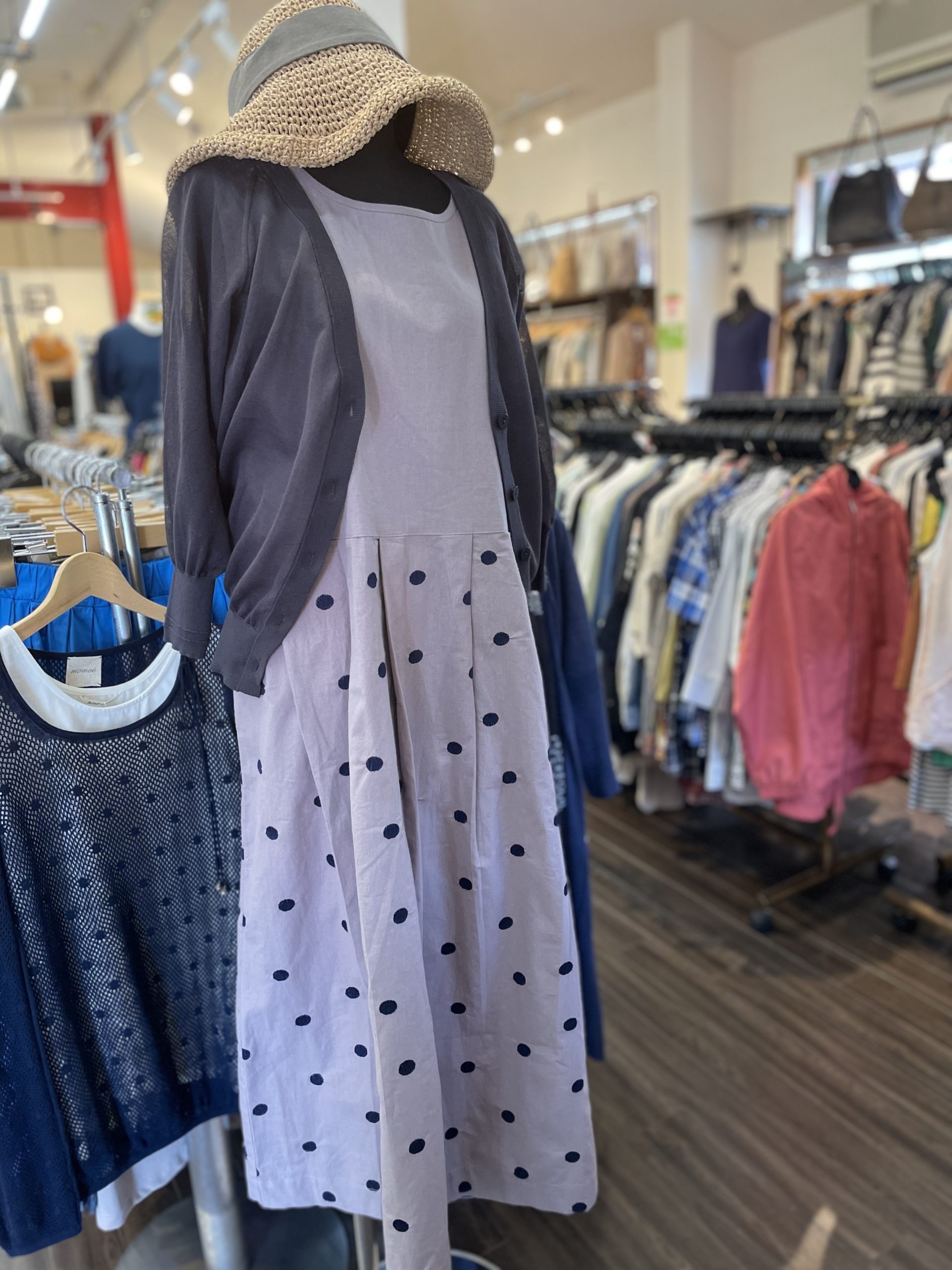 日に日に暑くなってきましたね。夕立の様な雨が降る日も増えてきたし梅雨入り間近な感じですね蒸し暑い日も増えてきたので半袖などお早めに見にきてくださいねでは今日も店頭の商品をご紹介します。 ドットの刺繍が可愛いコットンワンピ…