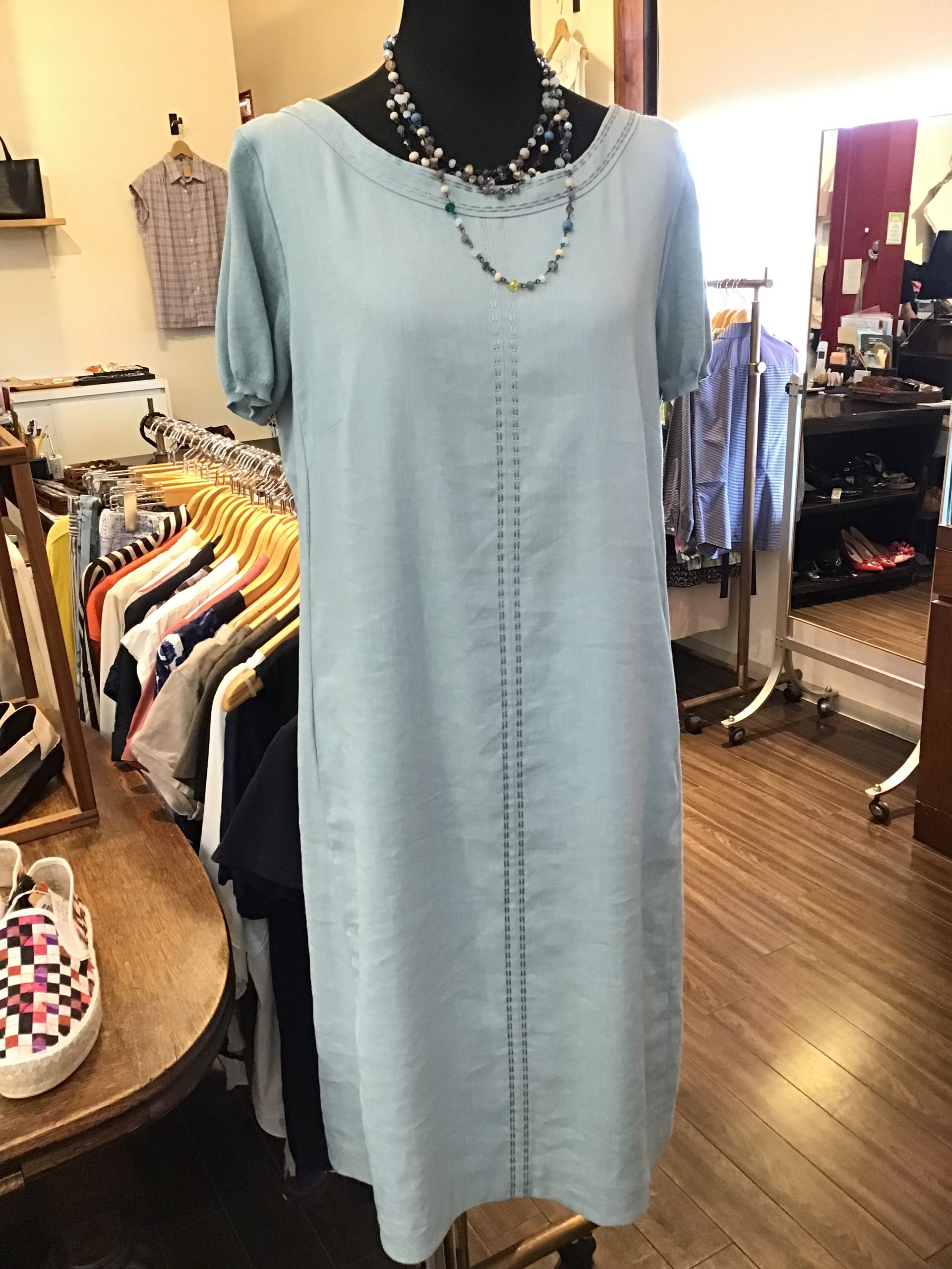今日四国地方が梅雨入りしました。明日は全国的に大雨の予報。お天気の良い時に見にきてくださいねー。では今日はワンピースを色々ご紹介します。夏になると一枚でストンと着れるワンピースが人気です こちらはフランスインポートブラン…