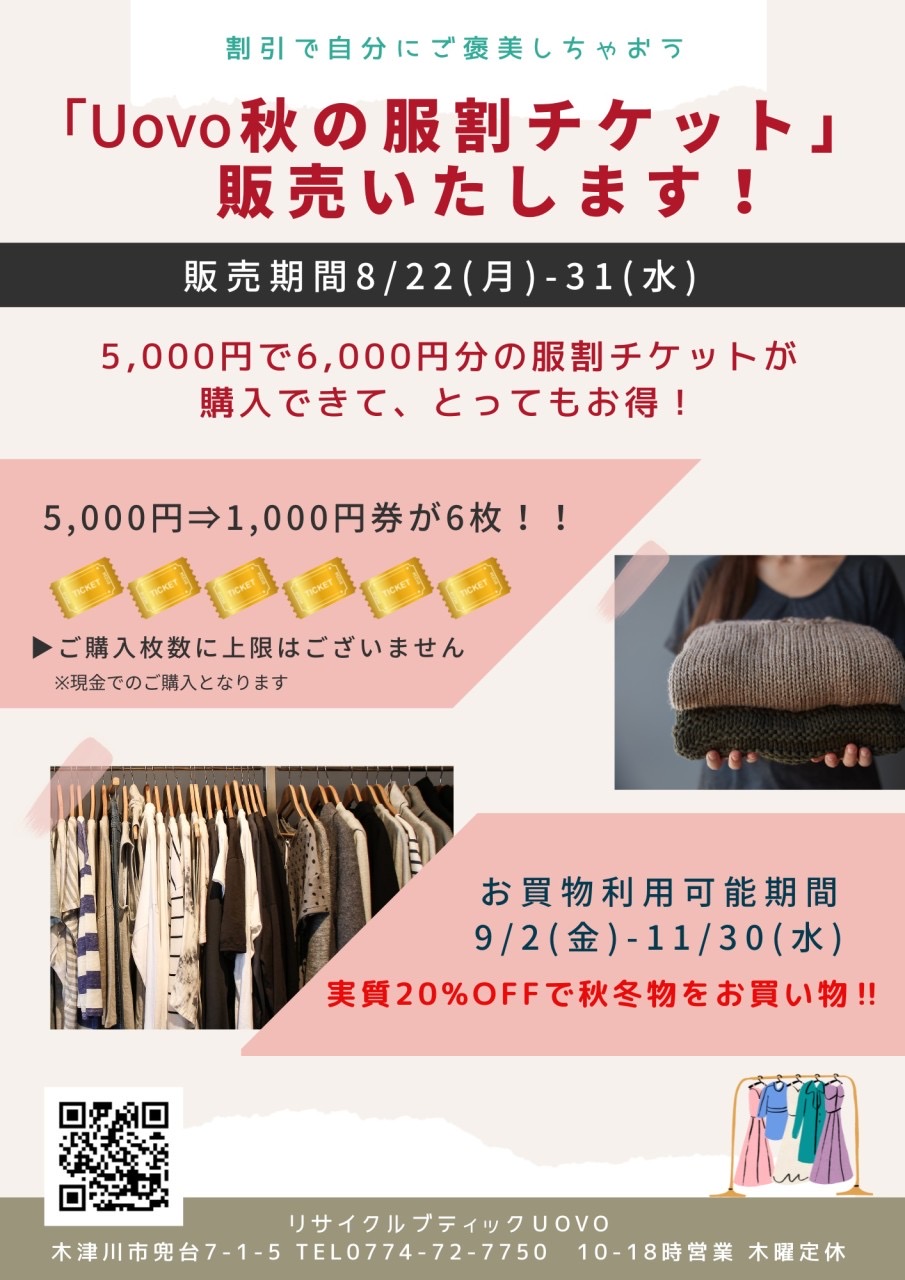 本日から秋冬物に使えるお得なお買い物券を販売します5,000円で6,000円分のお買い物券をお渡しします。 1,000円分もお得になるうれしいチケットです上限はありません。 10,000円で12,000円分。20000円…